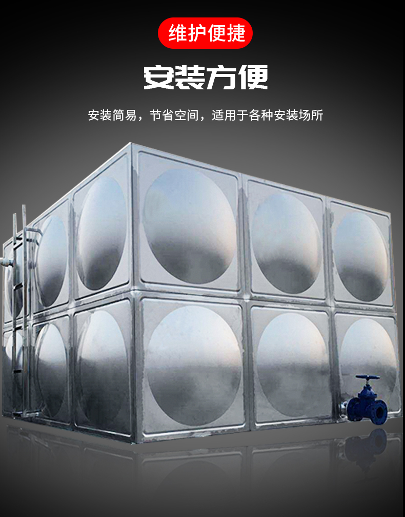 全封閉,有進水、出水、溢流、排污之功能,安裝簡便,您只需將水箱 置于房頂,接上水管即可使用,保養十分方便。不銹鋼水箱廣泛用于高樓公寓、工廠、學校、醫院、別墅及其它各個領域。